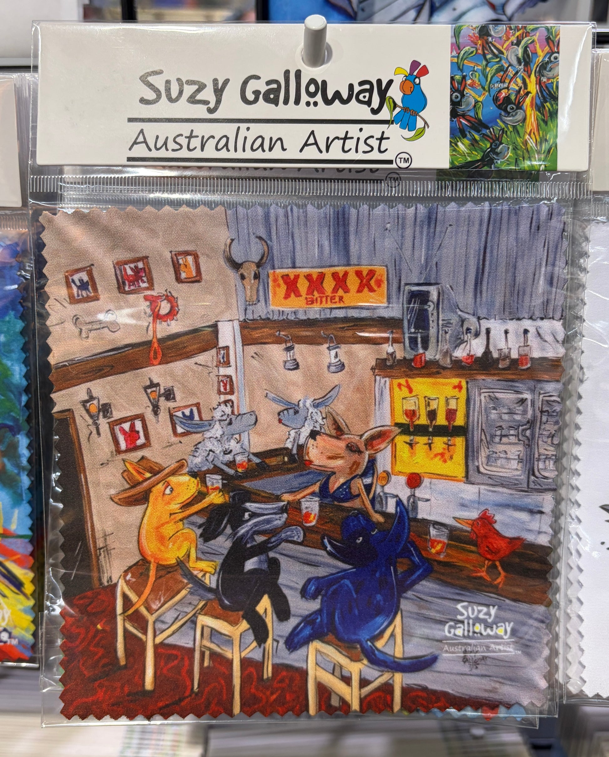 Suzy Galloway Australian Artist Original Art, printed (one side) onto lens cloth. 15cm x 15cm zig zag edge. Soft micro fibre material. Comes in bag with label ready to hang for display.
