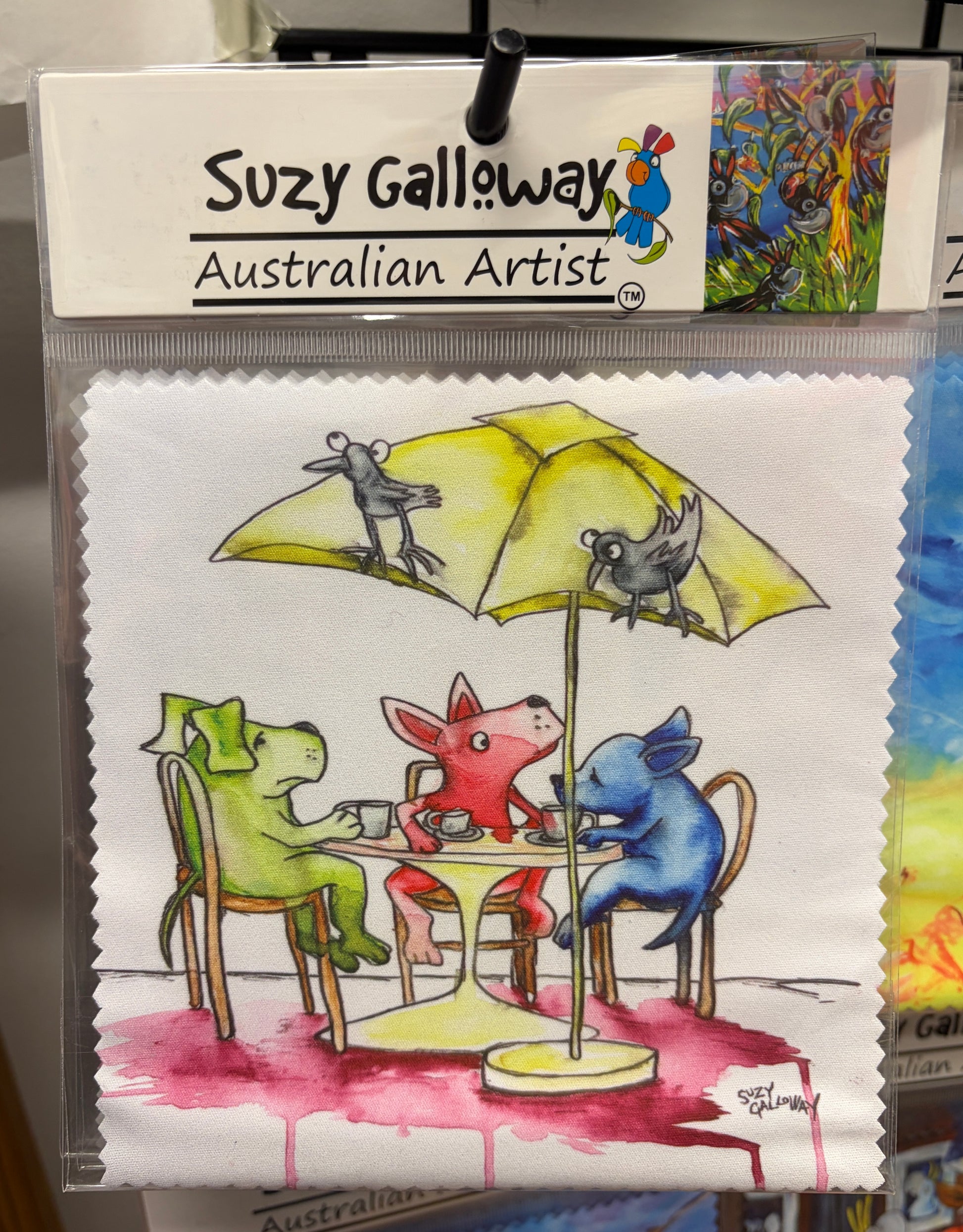 Suzy Galloway Australian Artist Original Art, printed (one side) onto lens cloth. 15cm x 15cm zig zag edge. Soft micro fibre material. Comes in bag with label ready to hang for display.