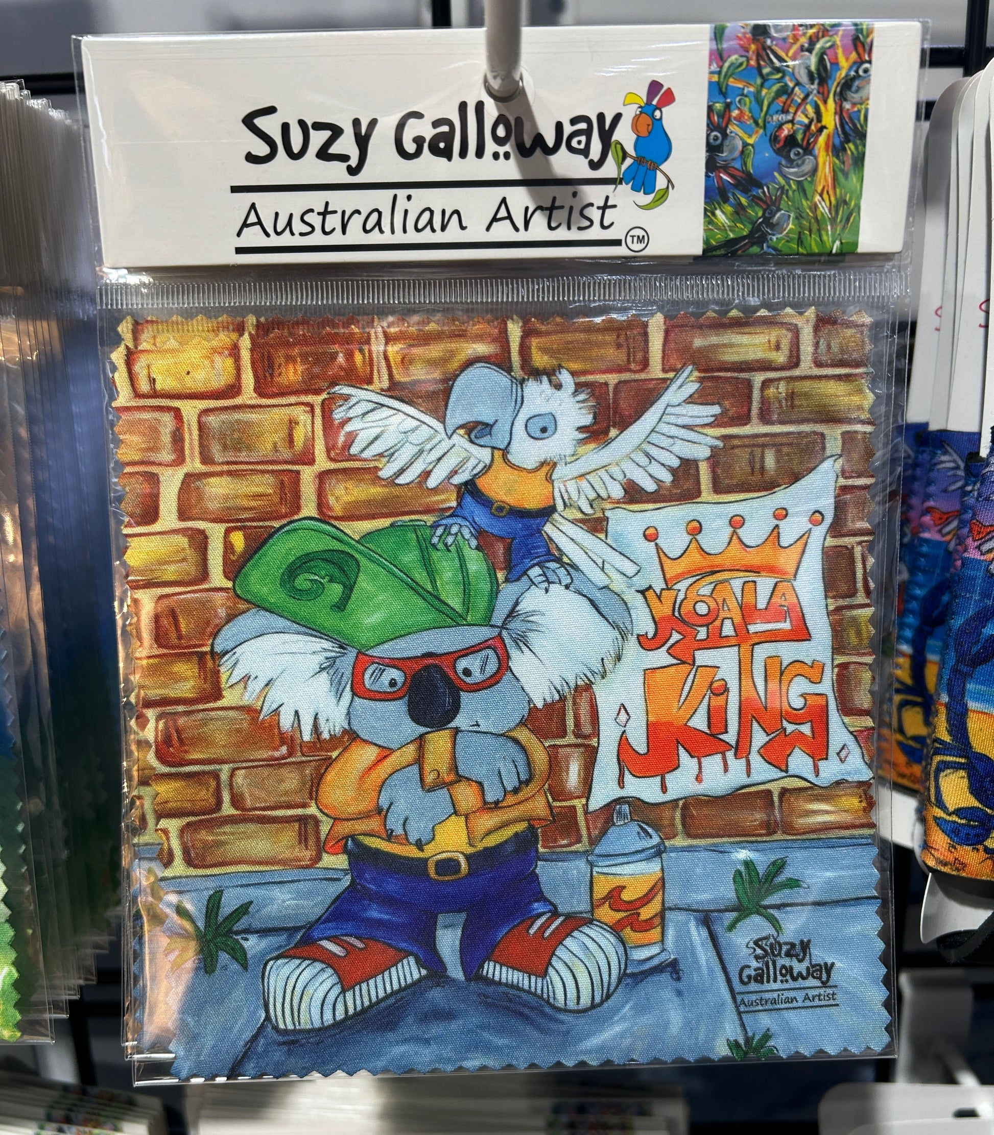 Suzy Galloway Australian Artist Original Art, printed (one side) onto lens cloth. 15cm x 15cm zig zag edge. Soft micro fibre material. Comes in bag with label ready to hang for display.