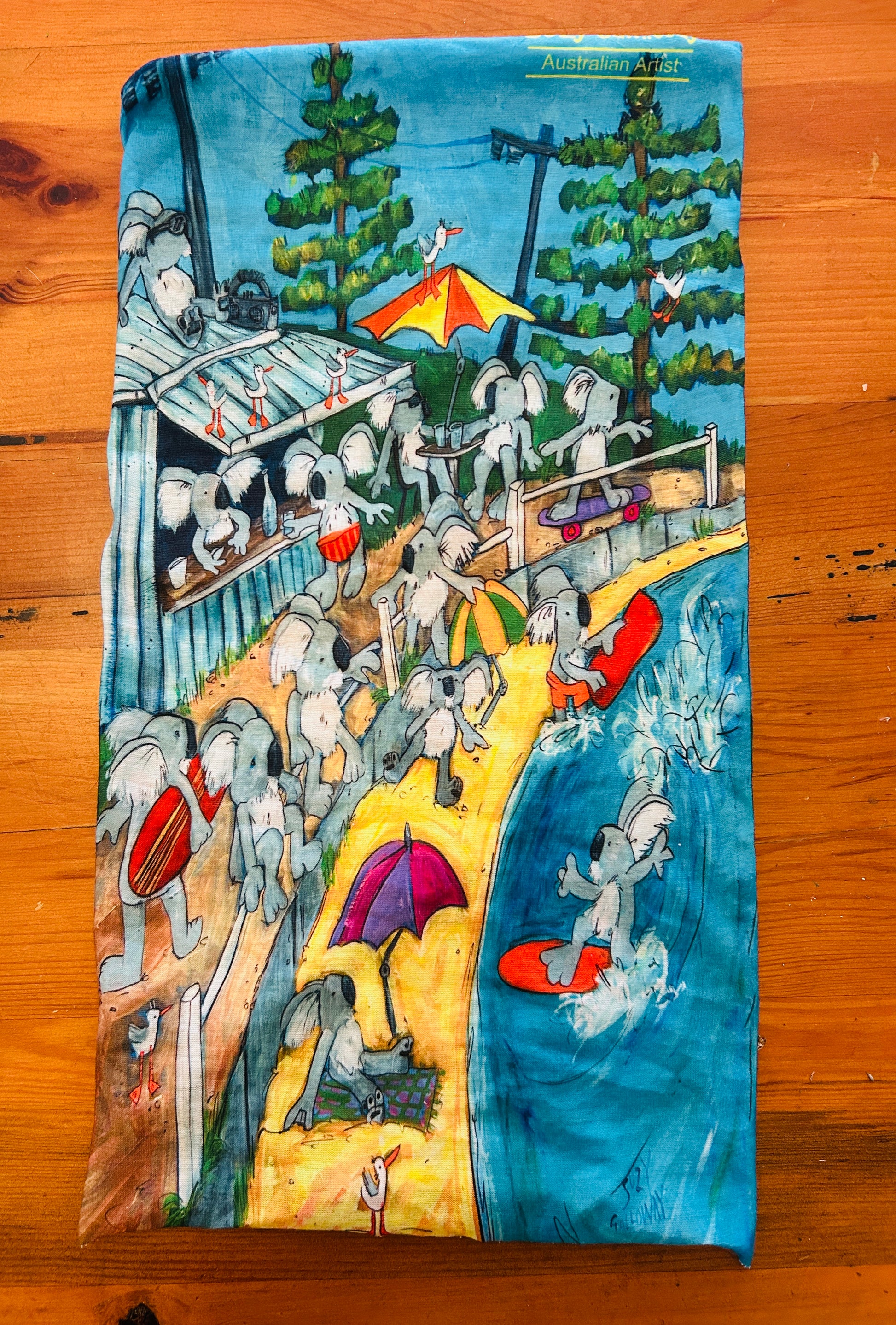 Suzy Galloway artwork design printed onto the Multi purpose head scarf /tube. Great for outdoors/ wind protection/ sun protection / fashion / wigs .