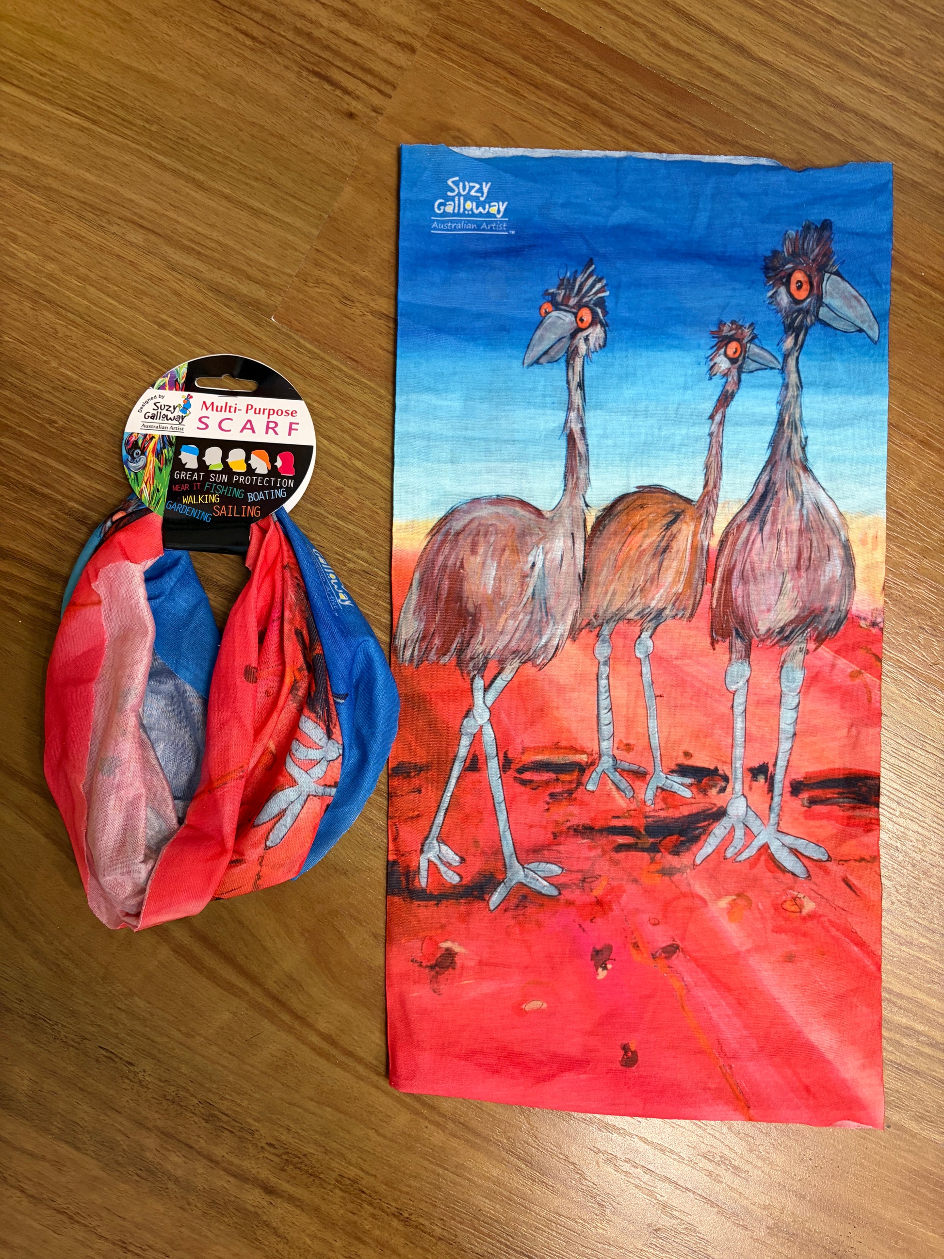 Suzy Galloway artwork design printed onto the Multi purpose head scarf /tube. Great for outdoors/ wind protection/ sun protection / fashion / wigs .